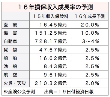損害保険業界団体、中華民国産物保険商業同業公会(産険公会)の陳燦煌理事長は18日、2016年の収入保険料は前年比2~4%増加し、1,400億台湾元(約4,8700億円)を超え、5年連続で過去最高を更新すると予測した。昨年の収入保険料は前年比2.9%増の1,354億元だった。19日付経済日報が報じた。
