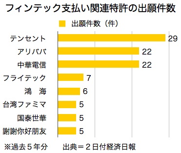 2日付経済日報によると、フィンテックの重要分野である支払い手段に関する過去5年間の特許出願状況によると、中国の電子商取引(EC)大手の騰訊控股(テンセント・ホールディングス)が29件、阿里巴巴集団(アリババ)が22件なのに対し、台湾勢は中華電信(22件)、飛捷科技(フライテック・テクノロジー)が7件、鴻海精密工業が6件など出遅れが目立つ。さらに、台湾金融業界による特許出願件数は累計で24件にすぎない。