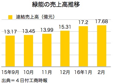 太陽電池用シリコンウエハー最大手、緑能科技(グリーン・エナジー・テクノロジー、GET)が3日発表した2月連結売上高は17億6,800万台湾元(約61億円)で、前月比2.8%増、前年比42.4%増と市場予測を大きく上回り、2011年5月以来の最高を更新した。4日付工商時報などが報じた。