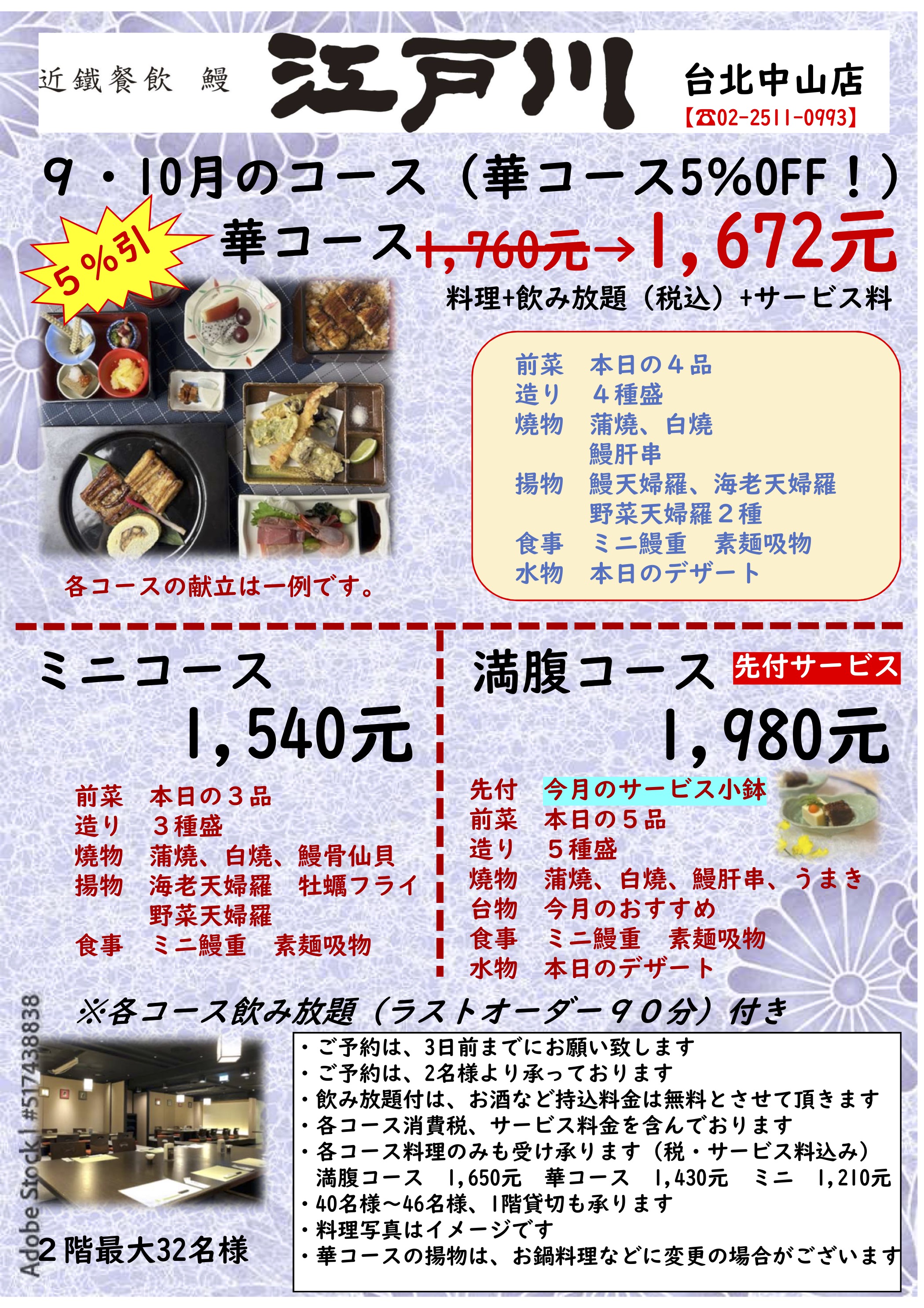 ・9月10月の宴会メニューは、華コースを5%引きの1,672元、満腹鍋コース1,980元に先付サービスを実施いたしております。