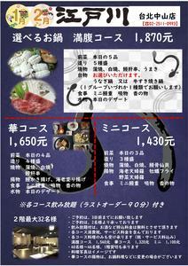 平素より「江戸川台北中山店」をご利用いただき、誠にありがとうございます。 1月2月のご宴会のお知らせ ◎1月2月は各コース(飲み放題付)を5%引きでご提供させていただきます。 ・満腹コース 1,980元 → 1,881元 ・華コース 1,760元 → 1,672元 ・ミ ……