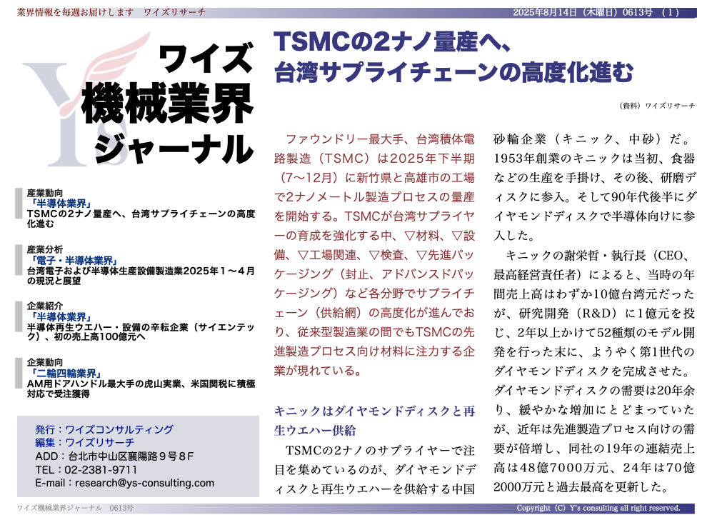 台湾積体電路製造(TSMC)は2025年下半期から新竹・高雄で2ナノ製造プロセスの量産を開始予定。材料、設備、工場関連、検査、先進封止など各分野で台湾企業の受注機会が拡大しており、キニック(ダイヤモンドディスク・再生ウエハー)、新応材(リンス液・EBR剤)、PSI、サイエンテックなどが生産能力を強化している。
