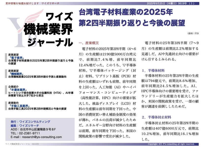第2四半期の生産額は2,190億5,000万元で前年同期比12.4%増。半導体材料(+24.5%)、半導体封止材料(+16.1%)、PCB材料(+10.8%)が堅調。一方、LCD材料(-6.8%)、エネルギー材料(-41.7%)は低迷。第3四半期もAIや先進封止需要が牽引する見通し。