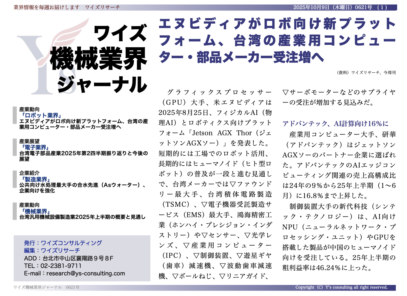 米エヌビディアは、フィジカルAI(物理AI)とロボティクス向けプラットフォーム「Jetson AGX Thor(ジェットソンAGXソー)」を発表。ヒューマノイド(ヒト型ロボット)普及を見据え、TSMC、鴻海(ホンハイ)、アドバンテック、新代科技、上銀科技(ハイウィン)など台湾主要メーカーの受注増が期待されている。
