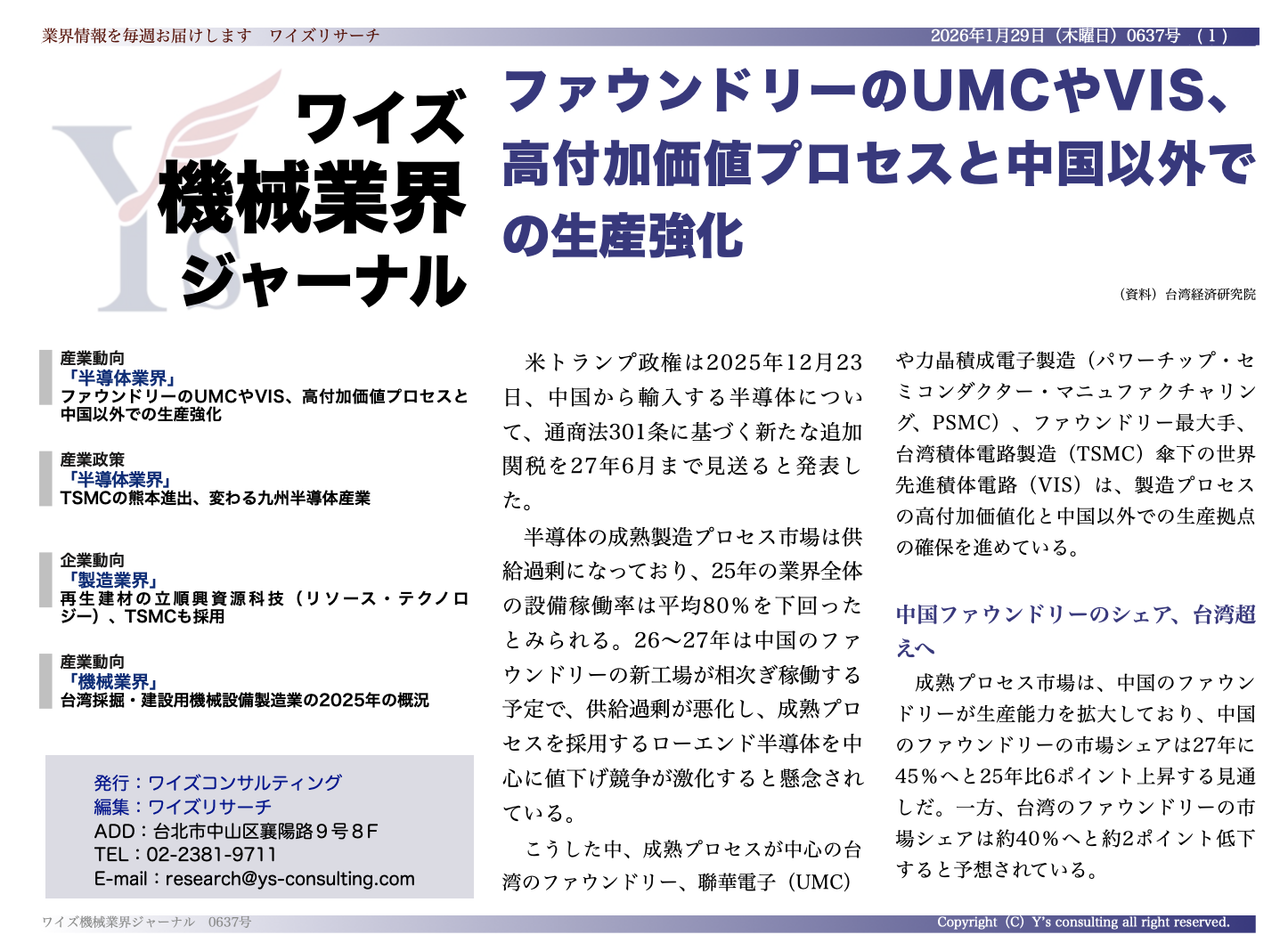 2025年の半導体成熟プロセス市場は供給過剰に陥り、業界稼働率は平均80%を下回りました。2027年にかけて中国ファウンドリーの市場シェアが45%へ上昇すると予想される中、UMCやVISなどの台湾勢は、米国の追加関税回避を見据え、特殊プロセスへの注力やシンガポール・米国への生産拠点シフトによる「脱中国ルート」の構築を急いでいます。