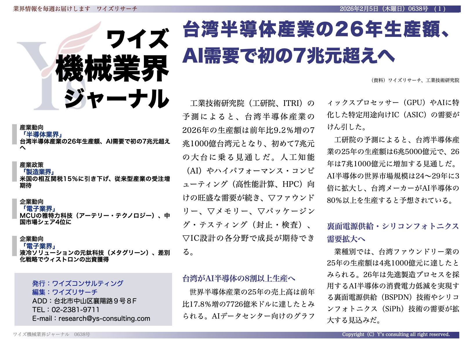 工研院(ITRI)の予測によると、2026年の台湾半導体産業の生産額は前年比9.2%増の7兆1,000億台湾元となり、初めて7兆元を突破する見通しです。AIおよびHPC(高性能計算)向けの需要が成長を牽引し、世界のAI半導体の80%以上を台湾メーカーが生産すると予測されています。技術面では、裏面電源供給(BSPDN)やシリコンフォトニクス(SiPh)、FOPLP(パネルレベルパッケージング)などの需要拡大が期待されます 。
