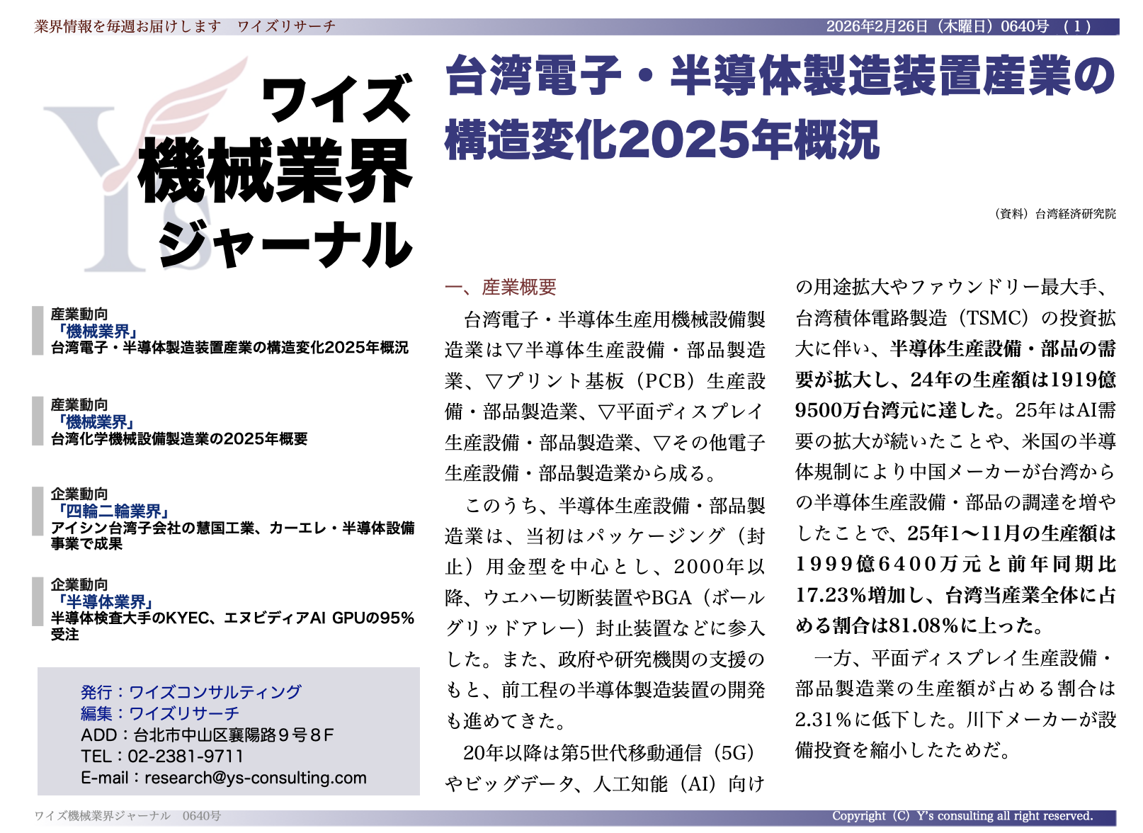 台湾電子・半導体生産用機械設備製造業の2025年1〜11月の生産額は、前年同期比17.23%増の1,999億6,400万台湾元に達しました 。AI需要の継続や、米国の半導体規制に伴う中国メーカーからの調達増が寄与しました 。また、TSMCなどの設備投資拡大により内需比率が60.81%へ上昇する一方、輸出先は中国から日本や米国へとシフトしています 。