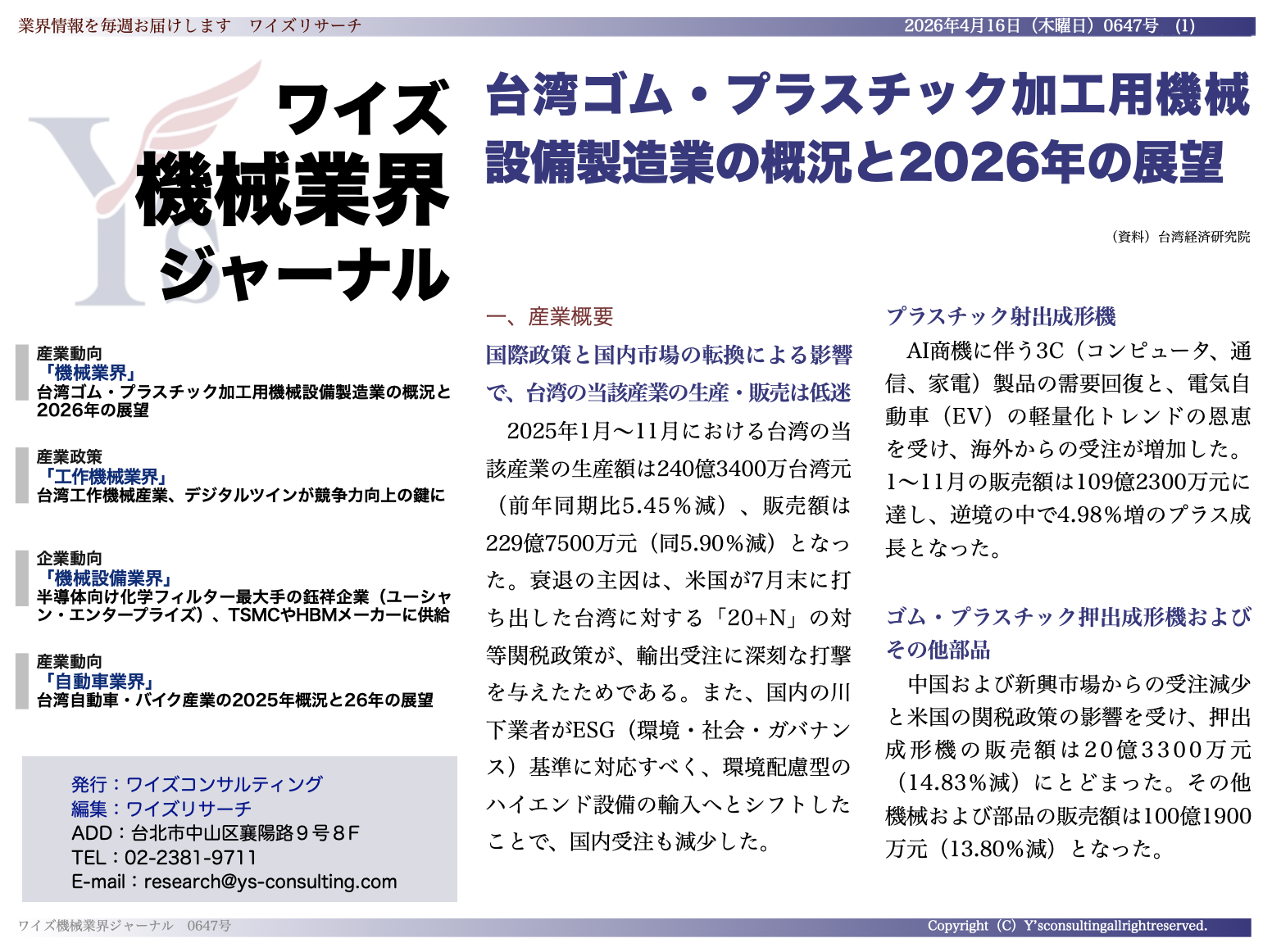 2025年1〜11月の台湾ゴム・プラスチック加工用機械設備の生産額は、米国の関税政策や国内の環境対応(ESG)設備シフトの影響を受け、前年同期比5.45%減となりました。2026年は、AI通信機器の拡大や中国の輸入調達拡大、ASEANにおけるEVサプライチェーン形成が成長エンジンとなり、業界全体がプラス成長に転じる見通しです。