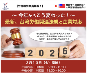 【開催の背景】 台湾では近年、職場環境の改善や労働者の権利保護を目的とした法改正が頻繁に行われており、進出企業にとっては迅速かつ正確な対応が求められています。 特に2026年は、「職場におけるハラスメント(パワハラ)防止義務と企業責任」や「外国人退職金制度の変更」、「育児休職等の制 ……